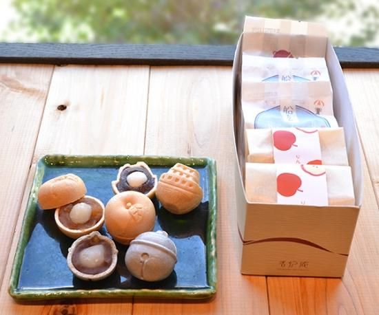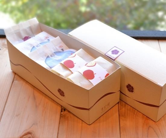 【りんご最中】砂糖(国内製造)、白手亡豆、もち米、麦芽糖、蜜漬りんご、羽二重粉、還元水飴、水飴、シナモンパウダー、寒天/酵素、グリシン、酸味料、酸化防止剤(V.C)、乳酸Ca